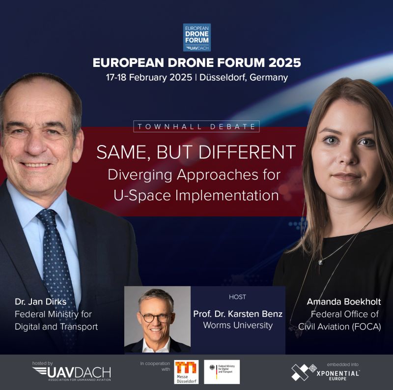 Amanda Boekholt, Acting Head of the Technology and Innovation Section at the Federal Office of Civil Aviation (FOCA), and Dr. Jan Dirks, Department LF 19 – Future of Aviation at the Federal Ministry for Digital and Transport, will discuss the current state of U-space implementation in Switzerland and Germany and discover similarities and differences. Prof. Dr Karsten Benz, Chairman of the Supervisory Board of Droniq and Professor of Air Traffic Management at Worms University, will host the town hall debate „Same, but different: Diverging approaches for U-Space implementation“ at the EUROPEAN DRONE FORUM in Düsseldorf.